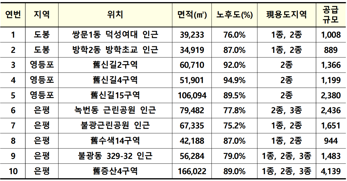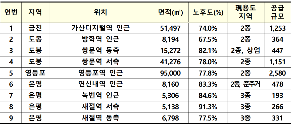 자치구별로 금천구 1곳, 도봉구 7곳, 영등포 4곳, 은평구 9곳이며, 이는 약 2.5만호를 공급할 수 있는 규모입니다.