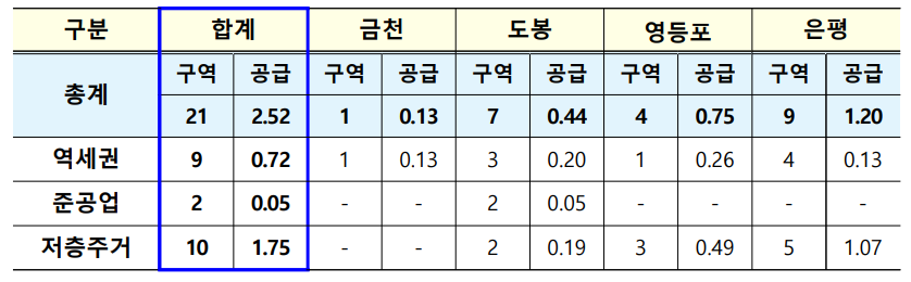 자치구별로 금천구 1곳, 도봉구 7곳, 영등포 4곳, 은평구 9곳이며, 이는 약 2.5만호를 공급할 수 있는 규모입니다.