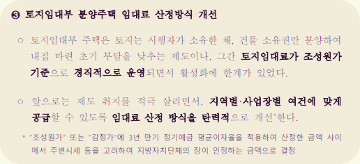 토지임대부 분양주책의 임대료 산정방식을 종전 조성원가 기준에서 조성원가 또는 감정가에 3년 만기 정기예금 평균이자율을 적용해 산정한 금액에서 주변 시세 등을 고려해 지방자치단체장이 탄력적으로 정할 수 있도록 하는 내용이 개정안에 포함되었다.