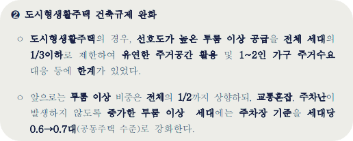 도시형생활주택의 경우 선호도가 높은 투룸(방2개) 이상 공급을 종전 1/3이하에서 1/2이하로 절반까지 상향해 1∼2인 가구 주거수요에 대응할 수 있도록 했다.