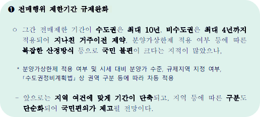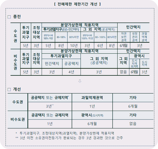 과거 전매제한 기간은 수도권은 최대 10년, 비수도권은 최대 4년까지 적용돼었으나, 이날부터 시행되는 개정안에 따르면 수도권은 공공택지·규제지역은 3년, 과밀억제권역은 1년, 그 외 지역은 6개월로 완화하고, 비수도권은 공공택지·규제지역은 1년, 광역시 도시지역은 6개월로 완화하고, 그 외 지역은 전면 폐지한다. 이번 전매제한 기간 완화는 개정안 공포·시행 이전에 공급된 주택에 대해서도 소급 적용된다.