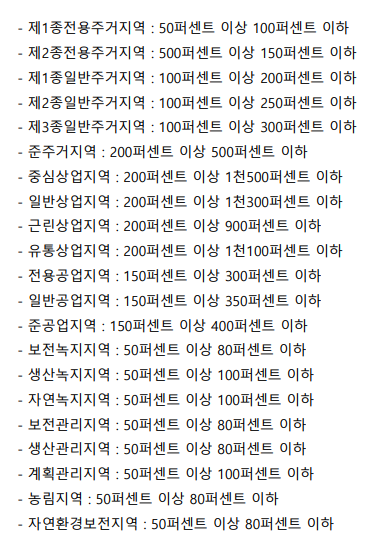 ▶ 용적률은 「국토의 계획 및 이용에 관한 법률」에서 정한 범위 안에서 특별시·광역시·특별자치시·특별자치도·시 또는 군의 조례로 정한다. 다만, 지구단위계획을 수립하는 등 필요한 경우 이를 완화하여 적용할 수 있다.