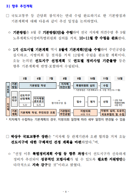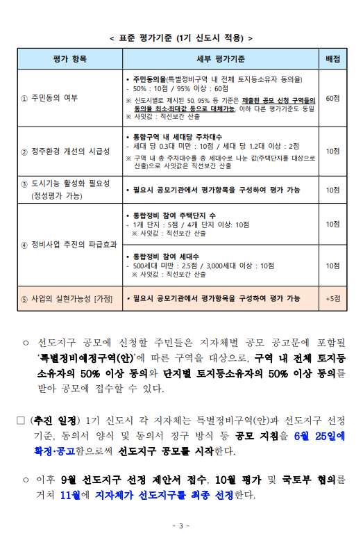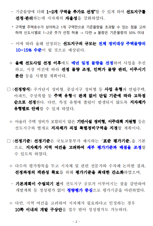'1기 신도시 선도지구, 올해 2.6만호+α (총 정비물량의 10~15% 내외) 선정' 국토교통부 보도자료에서 볼수 있듯 1기 신도시 선도지구에 대한 구체적인 선정 계획(선정규모, 선정방식, 선정기준, 추진 일정 등)을 마련하였습니다.