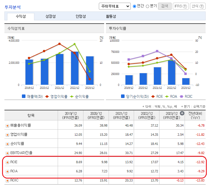 ▶ ROA : 자산 대비 이익률, 자산의 효율성을 판단