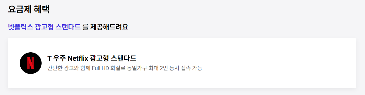 또한, 넷플릭스 요금 할인 방법은 국내 통신사(SKT, KT, LG U+)의 결합 상품 사용을 추천드립니다.(저는 SKT를 사용하므로 SKT 요금제 중 넷플릭스 서비스(광고형 스탠다드)를 제공하는 월 62,000원 요금제를 사용할 예정입니다.)