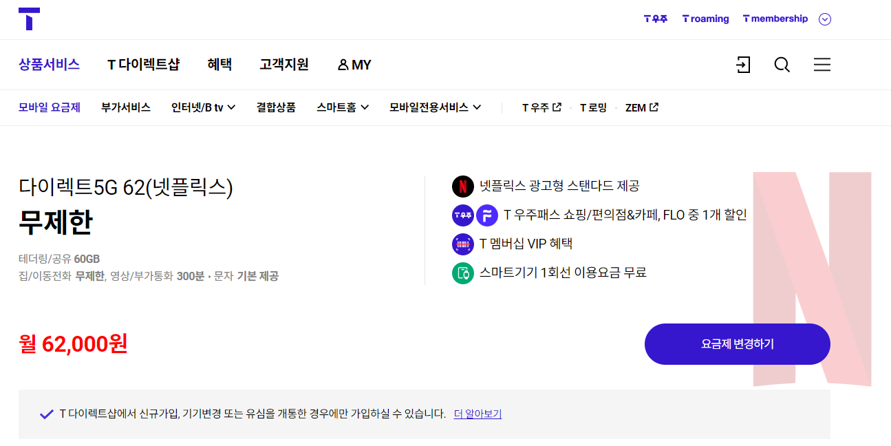 또한, 넷플릭스 요금 할인 방법은 국내 통신사(SKT, KT, LG U+)의 결합 상품 사용을 추천드립니다.(저는 SKT를 사용하므로 SKT 요금제 중 넷플릭스 서비스(광고형 스탠다드)를 제공하는 월 62,000원 요금제를 사용할 예정입니다.)