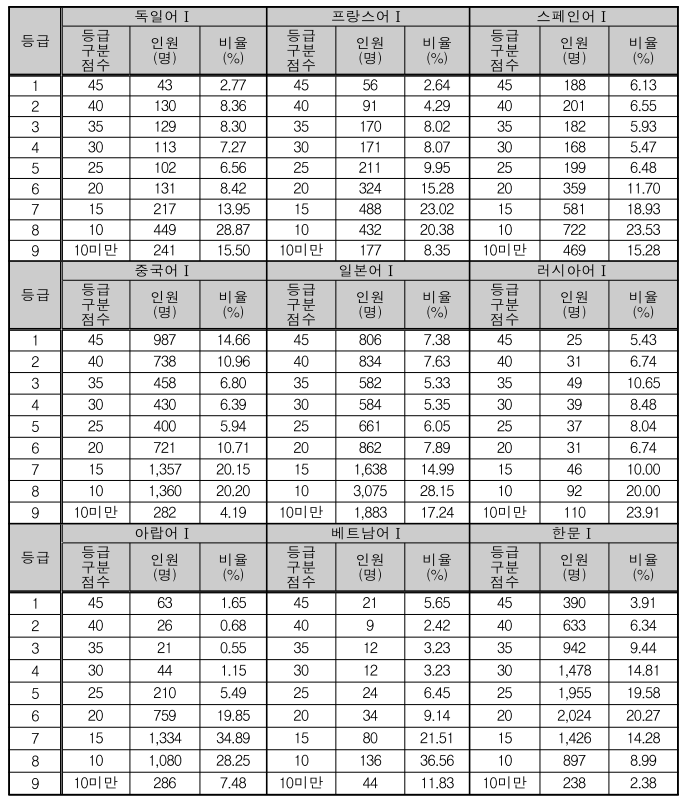 제2외국어/한문 영역 등급 구분 원점수, 등급별 인원 및 비율