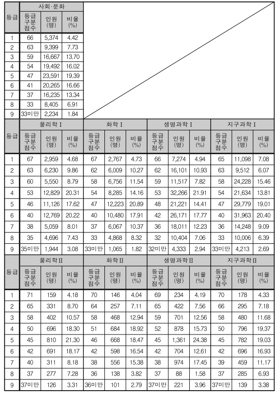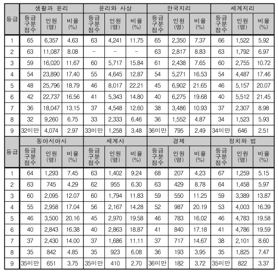사회/과학탐구 영역 등급 구분 표준점수, 등급별 인원 및 비율