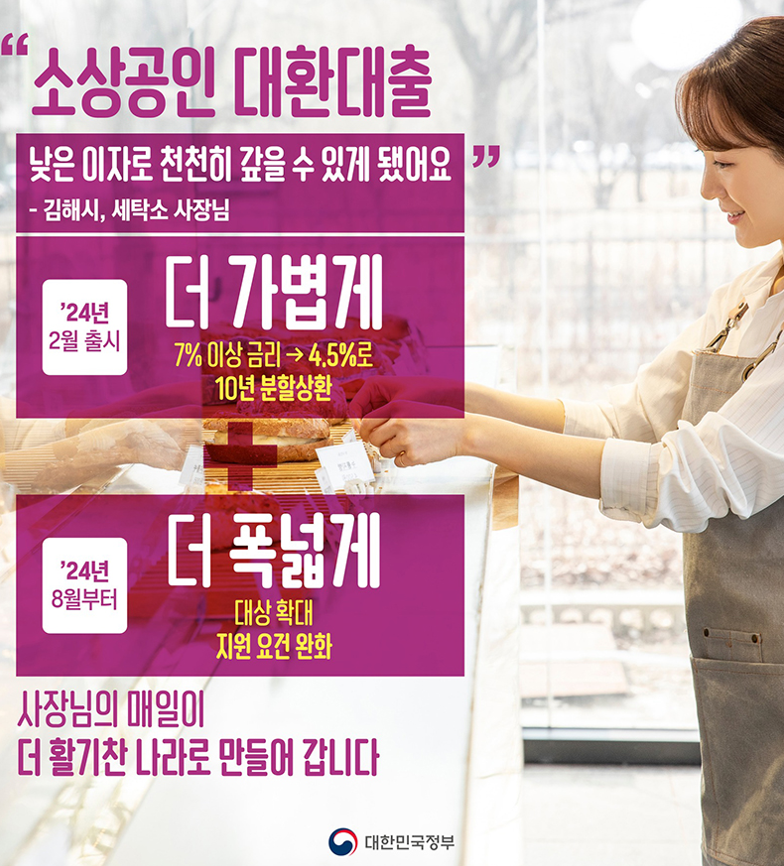 대한민국 정부에서는 이러한 상황을 너무나 잘 알고 있기에 소상공인 및 자영업자분들의 어려움 극복을 위하여 '소상공인 정책자금(대리대출)' 등의 대환대출, 대출금리 부담 낮추기 지원 제도를 운영하고 있습니다.
