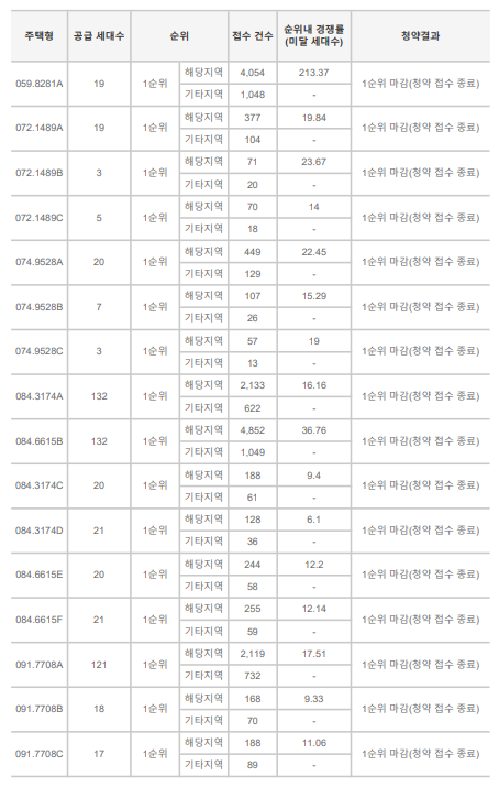 - 소형 면적인 59㎡, 72㎡, 74㎡과 국민평형인 전용 84는 모두 1순위 마감 성공으로 청약 접수 종료