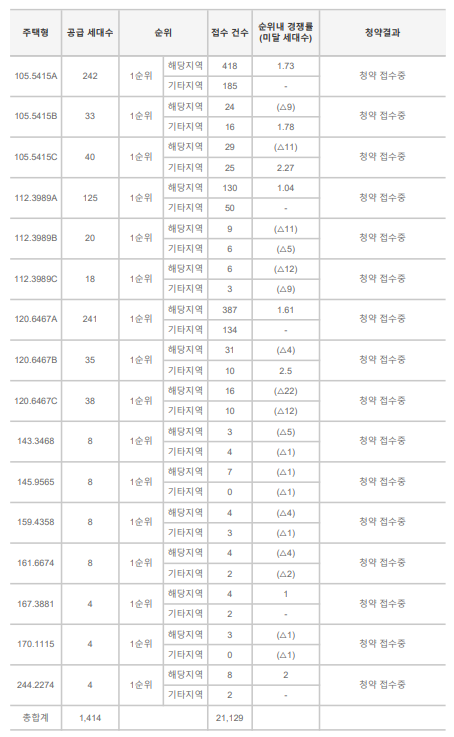 많은 분들이 예상하였던 것처럼 1순위 일반분양에서는 1,414세대 모집에 21, 219명이 신청하며 1순위 평균 14.9대 1의 경쟁률이 나왔습니다. 하지만 중대형 면적은 절반이 미달되는 상황입니다.