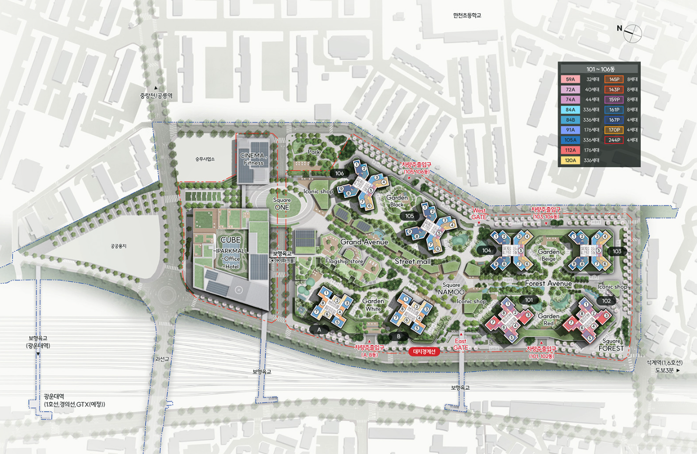 '서울원 아이파크'는 서울시 노원구 화랑로 45길 145일원에 HDC현대산업개발이 광운대 역세권 개발사업을 통해 1,856세대(지하 4층~지상 47층 6개동, 전용면적 59~244㎡ 규모)를 공급하는 대규모 사업입니다.