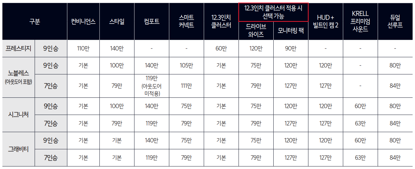 프레스티지 | 3,551 | - 스노우 화이트펄 : 8만 - 컨비니언스 - 스타일 - 컴포트 - 스마트 커넥트 - 12.3인치 클러스터 - 드라이브 와이즈 - 모니터링 팩 - HUD + 빌트인 캠 2 - KRELL 프리미엄 사운드 - 듀얼 선루프 - 그래비티 전용 : 57만 |