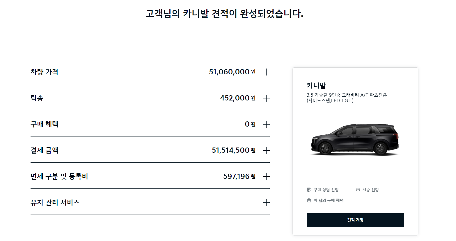 ★ 위 추천 파워트레인 및 옵션을 통한 카니발 견적금액(기아차 홈페이지 이용) ★