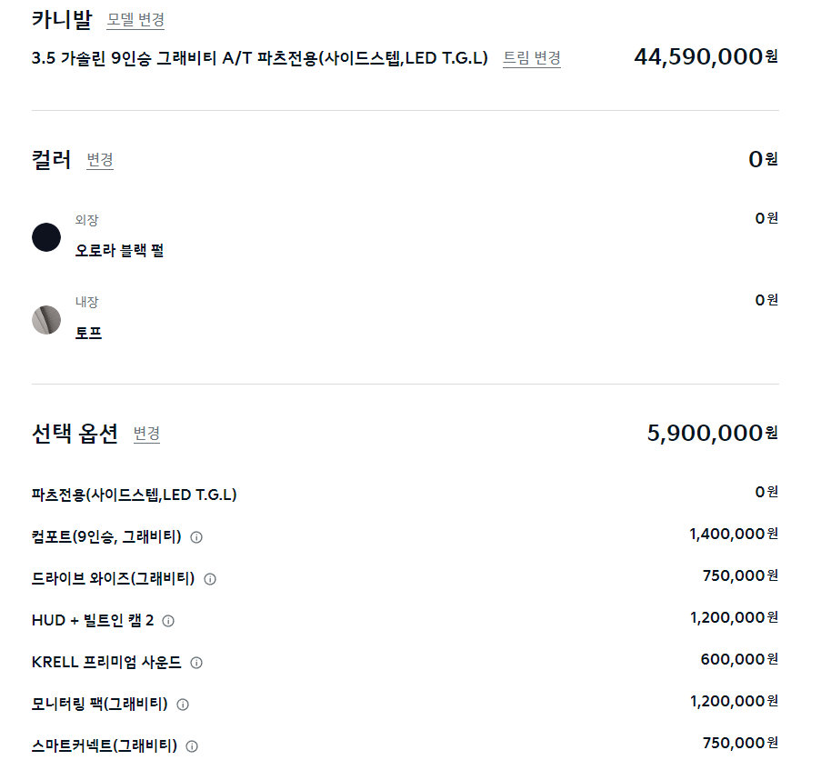 노블레스 | 4,250 | - 스노우 화이트펄 : 8만 - 스타일 - 컴포트 - 스마트 커넥트 - 드라이브 와이즈 - 모니터링 팩 - HUD + 빌트인 캠 2 - KRELL 프리미엄 사운드 - 듀얼 선루프 - 그래비티 전용 : 56만 |