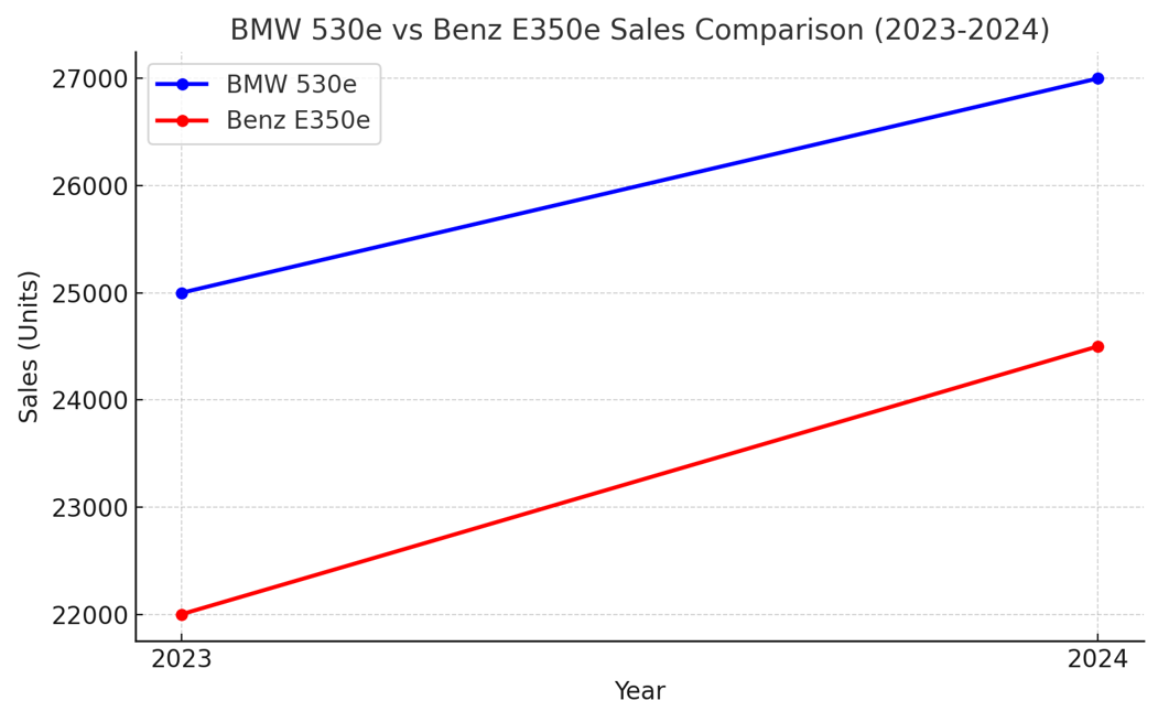 위의 그래프는 BMW 530e와 벤츠 E350e의 2년간(2023년~2024년)의 판매량을 비교한 것입니다. BMW 530e는 꾸준히 높은 판매량 증가세를 보이고 있으며, 벤츠 E350e도 안정적인 상승세를 나타내고 있습니다.